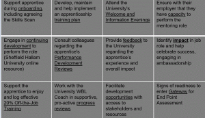 Your duties as an employer are governed by the Apprenticeship Funding rules set out by the Education and Skills Funding Agency. The key things are set out in the Commitment Statement that you as an employer have signed along with the University and the Apprentice. We have a shared duty to support the apprentice and a key part of that is for you, the employer, to put in place and support a mentor for the whole apprenticeship journey.