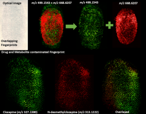 Matrix-assisted laser desorption/ionization mass spectrometry imaging (MALDI-MSI) coupled with the SELECT SERIES Cyclic ion mobility spectrometer (Cyclic IMS) would represent a significant advancement in the molecular fingerprinting capabilities thanks to the enhanced mass accuracy (sub ppm), resolution (~500,000 (FWHM)) and molecular identification afforded by the instrument. In particular, new methods are being developed on this instrument to detect and map antipsychotics and date rape drugs as well as blood in fingerprints.