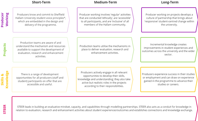 PEER wants to have an impact across three areas: Producer Working, Projects and Skills and Knowledge. The programme has short-, medium-, and long-term outcomes that it is working towards (see image). The Student Engagement, Evaluation, and Research (STEER) team also have an internal outcome that it is working towards; this outcome fits into the broader work undertaken by STEER.